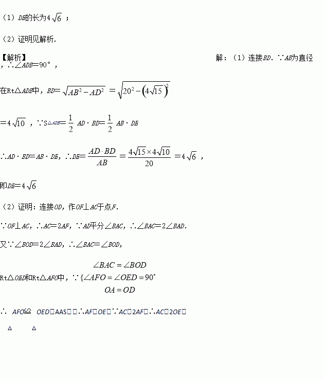 如图,C、D两点在以AB为直径的半圆O上,AD平分∠BAC,AB=20,AD=4