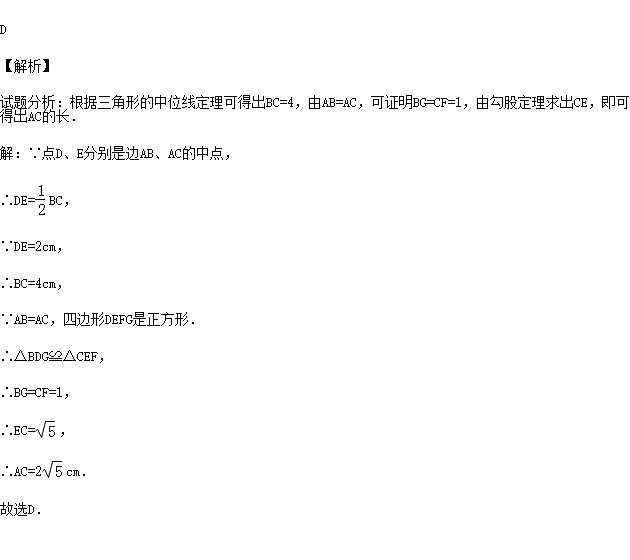 (2011•山西)如图,△ABC中,AB=AC,点D、E分别是边AB、AC的中点,点G、F在BC边上,四边形DEFG是正方形.若DE=2cm,则AC的长为( )