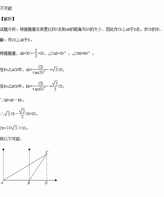 (2004•日照)如图,一艘渔船正以30海里/小时的速度由西向东赶鱼群,在A处看风小岛C在船的北偏东60度.40分钟后,渔船行至B处,此时看见小岛C在船的北偏东30度.已知以小岛C为中心周围10海里以内为我军导弹部队军事演习的着弹危险区,问这艘渔船继续向东追赶鱼群,是否有进入危险区的可能?