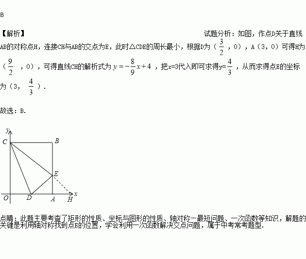 矩形OABC在平面直角坐标系中的位置如图所示,点B的坐标为(3,4),D是OA的中点,点E在AB上,当△CDE的周长最小时,点E的坐标为( )