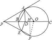 (3)由DE=EF=x得到PE=PF-EF=y-x,再利用PD•PO=PE•PF得到(y-x)y=3×4=12,加上xy=6,则y2=18,即PF=3$\sqrt{2}$,作FH⊥BC于H,如图,根据勾股定理,在Rt△PFH中得到HF2=PF2-PH2=18-(4-OH)2,在Rt△OFH中得到HF2=OF2-OH2=4-OH2,则18-(4-OH)2=4-OH2,解得OH=$\frac{1}{4}$,则PH=PO-OH=$\frac{15}{4}$,然后根据余弦的定义求cos∠OPF的值.