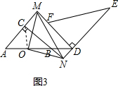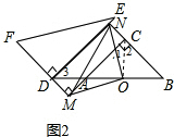 (2)如图2,连接OC,由∠ACB=∠DNB,∠B=∠B,于是推出△BCA∽△BND,根据相似三角形的性质得到$\frac{AC}{DN}=\frac{BC}{BN}$,推出∠NCM=90°=∠DNC,根据平行线的性质得到∠DMC=90°,证得四边形DMCN是矩形,根据矩形的性质得到DN=MC,根据三角形的内角和得到∠3=∠B=45°,证得DN=NB,求出MC=NB,推出∠1=∠2=45°=∠B,OC=OB(斜边中线等于斜边一半),得到△MOC≌△NOB(SAS),根据全等三角形的性质得到OM=ON,∠MOC=∠NOB,于是得到∠MOC-∠CON=∠NOB-∠CON,即可得到结论;(3)如图3,连接OC,根据已知条件推出四边形MDNC是矩形,根据矩形的性质得到CM=ND,根据三角形的内角和得到∠ADN=45°,于是得到∠ADN=∠DBN,由等腰三角形判定得到DN=BN,推出CM=BN,根据邻补角的定义得到∠MCO=135°,于是得到∠MCO=∠OBN,推出△OMC≌△ONB,根据全等三角形的性质得到∠COM=∠BON,OM=ON,由∠COB=90°,于是得到∠MOB+∠NOB=90°,即可得到结论.