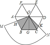 (2)过点O作OG⊥BC于点G,利用全等三角形的性质以及正六边形性质得出正六边形ABCDEF与扇形OMN重叠部分的面积为:S△AOB+S△OBC=2SOBC进而得出答案.
