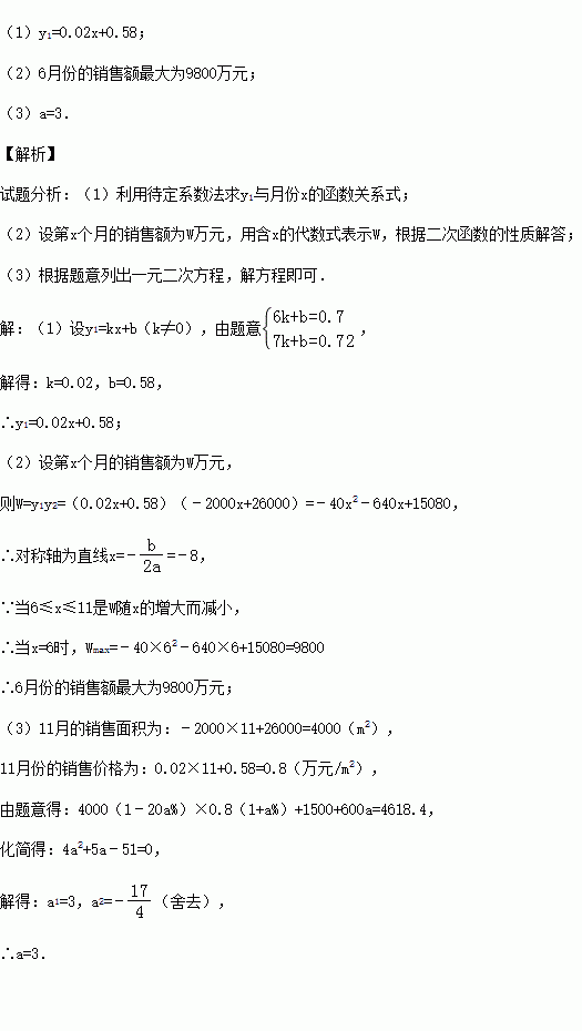 我市“上品”房地产开发公司于2010年5月份完工一商品房小区,6月初开始销售,其中6月的销售单价为0.7万元/m2,7月的销售单价为0.72万元/m2,且每月销售价格y1(单位:万元/m2)与月份x(6≤x≤11,x为整数)之间满足一次函数关系:每月的销售面积为y2(单位:m2),其中y2=﹣2000x+26000(6≤x≤11,x为整数).