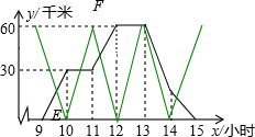 (3)根据题意,客车一小时行驶60千米,故它的图象是两小时一个来回.从左向右看,两条折线的第二个交点就是它们第二次相遇.求出EF的函数解析式就可以了,找到特殊点(10,0)和(11,60)利用待定系数法可以求出其解析式.