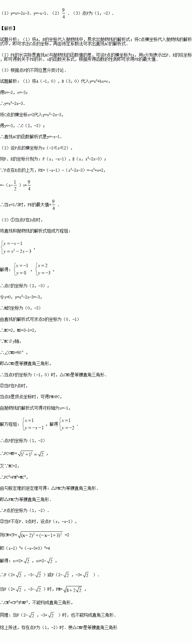 (3)点M(m,-3)是抛物线上一点,问在直线AC上是否存在点F,使△CMF是等腰直角三角形?如果存在,请求出点F的坐标;如果不存在,请说明理由.