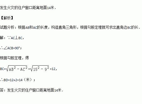 如图,一高层住宅发生火灾,消防车立即赶到距大厦9米处(车尾到大厦墙面),升起云梯到火灾窗口,已知云梯长15米,云梯底部距地面2米,问:发生火灾的住户窗口距离地面多高?