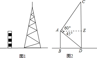 (2011•淮安)图1为平地上一幢建筑物与铁塔图,图2为其示意图.建筑物AB与铁塔CD都垂直于地面,BD=30m,在A点测得D点的俯角为45°,测得C点的仰角为60°.求铁塔CD的高度.![]()