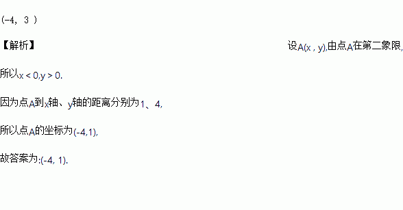 在平面直角坐标系中,点 A 在第二象限 ,且到X 轴的距离是3个单位长度,到Y 轴的距离是4个单位长度,则点 A 的坐标是_________ 。