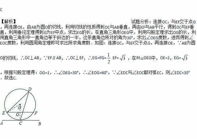 如图,直线AB与半径为2的⊙O相切于点C,点D、E、F是⊙O上三个点,EF∥AB,若EF=