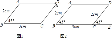 分析:首先画∠B=45°,在∠ABC的边上截取AB=2cm,BC=3cm,然后以A为圆心,AB长为半径画弧,再以C为圆心,BC长为半径画弧,两弧交于点D,连接AD、CD即可得到平行四边形ABCD;