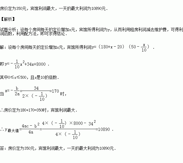 (2013秋•沙洋县期末)某宾馆有50个房间供游客居住,当每个房间的定价为每天180元时,房间会全部住满,当每个房间每天的定价每增加10元时,就会有一个房间空闲.如果游客居住房间,宾馆需对每个房间每天支出20元的各种费用,房价定为多少时,宾馆利润最大?并求出一天的最大利润.