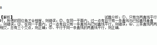 ①同位角相等;②过一点有且只有一条直线与已知直线垂直;③过一点有且只有一条直线与已知直线平行;④三条直线两两相交,总有三个交点;⑤若