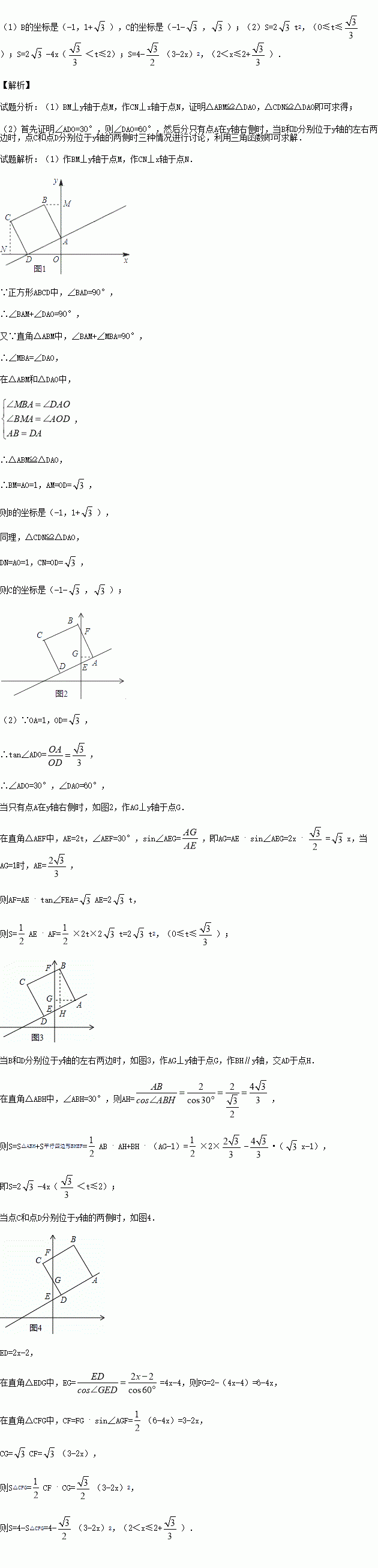 £¨2£©ÈôÕý·½ÐÎÒÔÿÃë2¸öµ¥Î»³¤¶ÈµÄËÙ¶ÈÑØÉäÏßDAÏòÉÏÆ½ÒÆ£¬Ö±ÖÁÕý·½ÐεĶ¥µãCÂäÔÚyÖáÉÏʱֹͣÔ˶¯£®ÔÚÔ˶¯¹ý³ÌÖУ¬ÉèÕý·½ÐÎÂäÔÚyÖáÓҲಿ·ÖµÄÃæ»ýΪS£¬ÇóS¹ØÓÚÆ½ÒÆÊ±¼ät£¨Ã룩µÄº¯Êý¹ØÏµÊ½£¬²¢Ð´³öÏàÓ¦µÄ×Ô±äÁ¿tµÄȡֵ·¶Î§£®