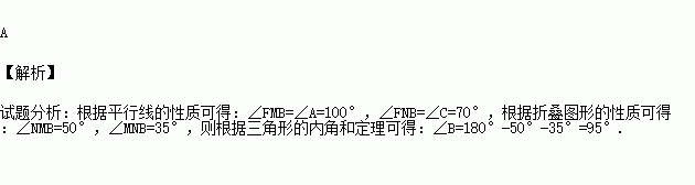 如图,四边形ABCD中,点M,N分别在AB,BC上,将△BMN沿MN翻折,得△FMN,若MF∥AD,FN∥DC,则∠B =( )