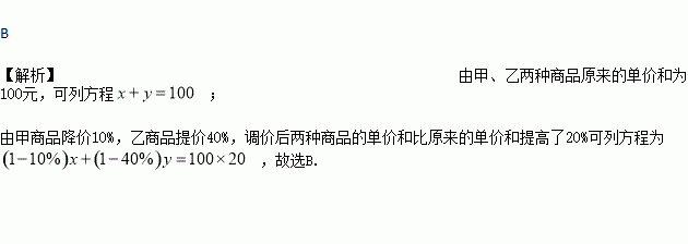 甲、乙两种商品原来的单价和为100元,因市场变化,甲商品降价10%,乙商品提价40%,调价后两种商品的单价和比原来的单价和提高了20%、若设甲、乙两种商品原来的单价分别为x元、y元,则下列方程组正确的是( )