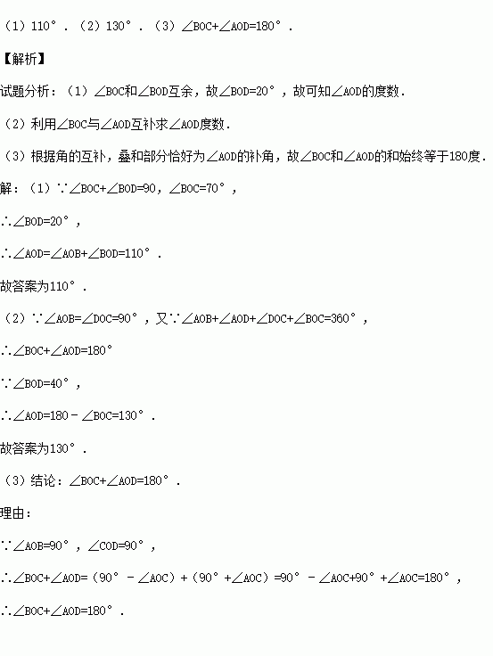 (1)如图1,若∠BOC=70°,则∠AOD= .