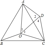 分析 (1)如图,根据等边三角形的性质得∠ACB=60°,CA=CB,∠OCD=∠3=∠4=60°,OC=CD,则利用旋转的定义,把△BCO绕点C顺时针旋转60°可得到△ACD,再根据旋转的性质得∠ADC=∠BOC=α,于是可计算出∠2=∠ADC-∠4=90°,∠1=360°-150°-60°-110°=40°,所以△AOD为直角三角形;