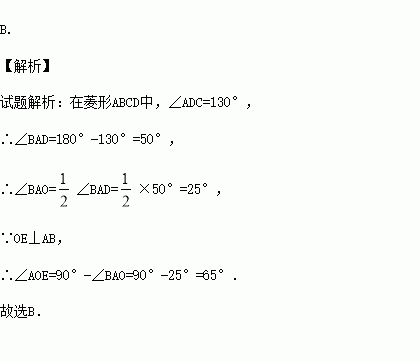 如图,在菱形ABCD中,对角线AC与BD交于点O,OE⊥AB,垂足为E,若∠ADC=130°,则∠AOE的大小为( )