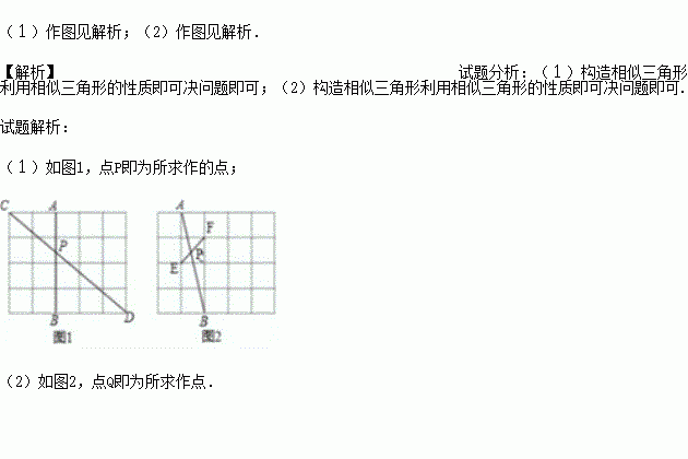如图,将线段AB放在边长为1的小正方形网格中,点A、B均落在格点上,请用无刻度直尺按条件分别在图1、图2中的线段AB上画出点P,保留连线痕迹.要求: