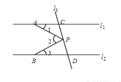分别交于C,D两点,有一点P在C,D之间运动(不与C,D两点重合),在它运动过程中,试分析∠1 、∠2 、∠3三者之间的关系?