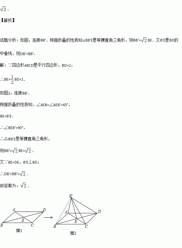 如图,?ABCD中,对角线AC与BD相交于点E,∠AEB=45°,BD=2,将△ABC沿AC所在直线翻折180°到其原来所在的同一平面内,若点B的落点记为B′,则DB′的长为 .
