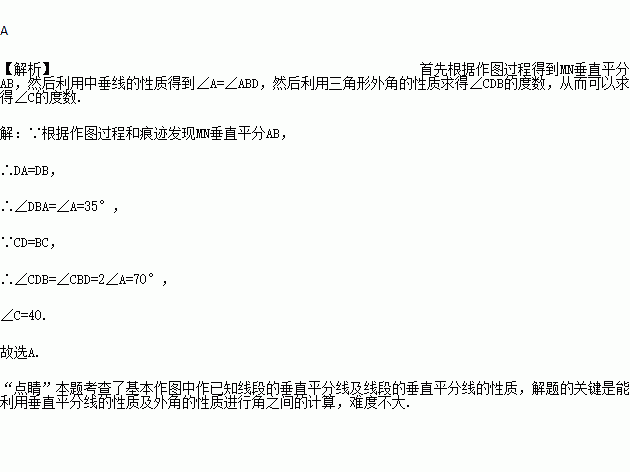 AB的长为半径画弧,两弧相交于点M、N;②作直线MN交AC于点D,连接BD.若CD=CB,∠A=35°,则∠C等于( )