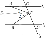 分析:(1)当P点在C、D之间运动时,首先过点P作PE∥l1,由l1∥l2,可得PE∥l2∥l1,根据两直线平行,内错角相等,即可求得:∠APB=∠PAC+∠PBD.