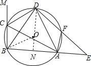 分析 (1)由CD是△ABC的外角平分线,可得∠MCD=∠ACD,又由∠MCD+∠BCD=180°,∠BCD+∠BAD=180°,可得∠MCD=∠BAD,继而证得∠ABD=∠BAD,即可得DB=DA;