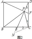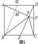分析 先证明△ADF≌△DCE得到AF=DE,则可对②进行判断;由全等性质得∠DAF=∠CDE,则利用∠DAF+∠DFA=90°可得∠CDE+∠DFA=90°,则可对①进行判断;作BG∥DE交AF于M,交AD于G,如图1,证明BM垂直平分AP得到BP=BA=AD,则可对③进行判断;延长DE到N使EN=PF,连结CN,如图2,先证明△CFP≌△CEN得到CP=CN,∠1=∠2,再证明△PCN为等腰直角三角形,然后根据等腰直角三角形的性质对④进行判断.
