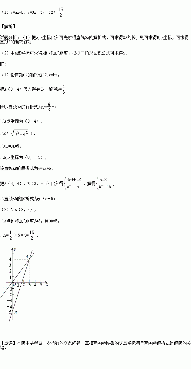 如图,一个正比例函数与一个一次函数的图象交于点A(3,4),其中一次函数与y轴交于B点,且OA=OB.
