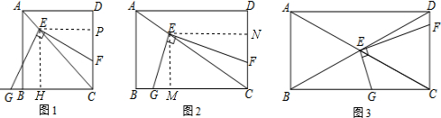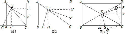 (3)过点E作EM⊥BC于M,过点E作EN⊥CD于N,垂足分别为M、N,过点C作CP⊥EG交EG的延长线于点P,过点C作CQ⊥EF垂足为Q,可得四边形EPCQ是矩形,四边形EMCN是矩形,可得EC平分∠FEG,可得矩形EPCQ是正方形,然后易证△PCG≌△QCF(AAS),进而可得:CG=CF,由(2)知:$\frac{EF}{EG}=\frac{EN}{EM}$=$\frac{BC}{AB}$=2,进而可得:EF=2EG,然后易证EM和EN分别是△ABC和△BCD的中位线,进而可得:EM=1,EN=2,MC=2,CN=1,然后易证△EMG∽△ENF,进而可得$\frac{MG}{NF}=\frac{EM}{EN}=\frac{1}{2}$,即NF=2MG,然后设MG=x,根据CG=CF,列出方程即可解出x的值,即MG的值,然后在Rt△EMG中,由勾股定理即可求出EG的值,进而可得EF的值.