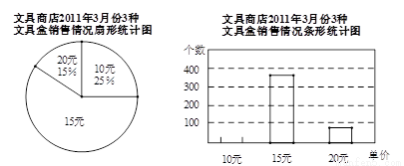 某文具商店共有单价分别为10元、15元和20元的3种文具盒出售,该商店统计了今年3月份这3种文具盒共销售600个,并绘制统计图如下: