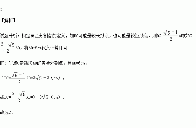 (2015秋•保定期末)点C是线段AB的黄金分割点,且AB=6cm,则BC的长为( )
