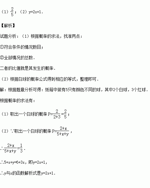 (2)若往装有5个球的原纸箱中,再放入x个白球和y个红球,从箱中随机取出一个白球的概率是