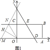 (2)如图1假设存在ON平分∠CNM的情况,①当直线PM与边BC和边OA相交时,过O作OH⊥PM于H由ON平分∠CNM,OC⊥BC,得到OH=OC=6,由(1)知OP=12,得到∠OPM=30°由三角函数的定义求得OM=OP•tan30°=4$\sqrt{3}$,DM=8-4$\sqrt{3}$;②当直线PM与直线BC和x轴相交时同上可得DM=8$+4\sqrt{3}$;