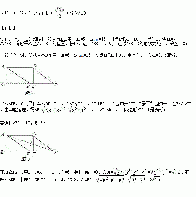 (1)如图1,纸片?ABCD中,AD=5,S?ABCD=15,过点A作AE⊥BC,垂足为E,沿AE剪下△ABE,将它平移至△DCE′的位置,拼成四边形AEE′D,则四边形AEE′D的形状为________.