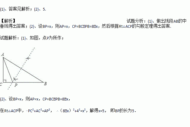 (1)用尺规在边BC上求作一点P,使PA=PB(不写作法,保留作图痕迹);