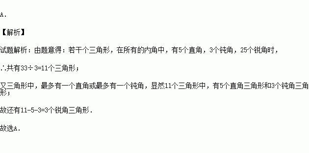 现有若干个三角形,在所有的内角中,有5个直角,3个钝角,25个锐角,则在这些三角形中锐角三角形的个数是( )