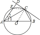 分析 (1)连接OC,由C为$\widehat{BE}$的中点,得到∠1=∠2,等量代换得到∠2=∠ACO,根据平行线的性质得到OC⊥CD,即可得到结论;