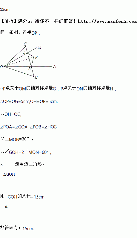 如图,∠MON内有一点P,P点关于OM的对称点是G,P点关于ON的对称点是H,GH分别交OM、ON于A、B点,若∠MON=30°,OG=5cm,则△GOH的周长为_____.