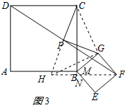 £¨3£©¹ýµãF×÷FH¡ÎDC½»CPµÄÑÓ³¤ÏßÓÚH£¬½»CBµÄÑÓ³¤ÏßÓÚN£¬½»BEÓÚM£¬Á¬½ÓCG¡¢HG£¬ÓÉASAÖ¤µÃ¡÷CDP¡Õ¡÷FHP£¬µÃ³öCP=PH£¬CD=FH£¬ÔÙÓÉSASÖ¤µÃ¡÷CBG¡Õ¡÷FHG£¬µÃ³öCG=GH£¬¡ÏBGC=¡ÏFGH£¬Ö¤µÃ¡÷CGHÊǵÈÑüÖ±½ÇÈý½ÇÐΣ¬¼´¿ÉµÃ³ö½áÂÛ£®