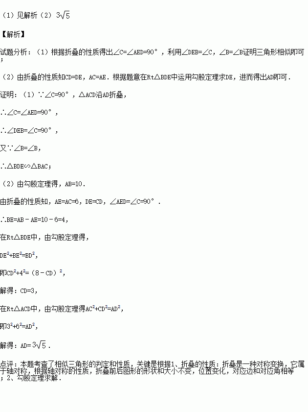 (2)已知AC=6,BC=8,求线段AD的长度.