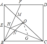 下列命题:如图,正方形ABCD中,E、F分别为AB、AD上的点,AF=BE,CE、BF交于H,BF交AC于M,O为AC的中点,OB交CE于N,连OH.下列结论中: