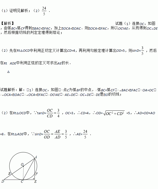如图,AB为⊙O的直径,C、F为⊙O上两点,且点C为弧BF的中点,过点C作AF的垂线,交AF的延长线于点E,交AB的延长线于点D.