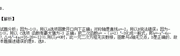 对二次函数y= -(x+2)2-3,描述错误的是( ).
