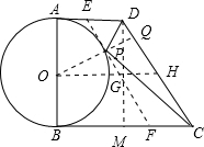 分析:由CD是固定的,所以当P到CD的距离最小时△PCD的面积最小,过P作EF∥CD,交AD于点E,交BC于点F,当EF与⊙O相切时,P到CD的距离最短,连接OP并延长交CD于点Q,过O作OH∥BC,交EF于点G,交CD于点H,则可知OH为梯形ABCD的中位线,OG为梯形ABFE的中位线,可求得OH,过D作DM⊥BC于点M,可求得CD=EF=5,由切线长定理可知AE=EP,BF=PF,可得AE+BF=EF=5,可求得OG=2.5,可求得GH=2,又OP=2,且