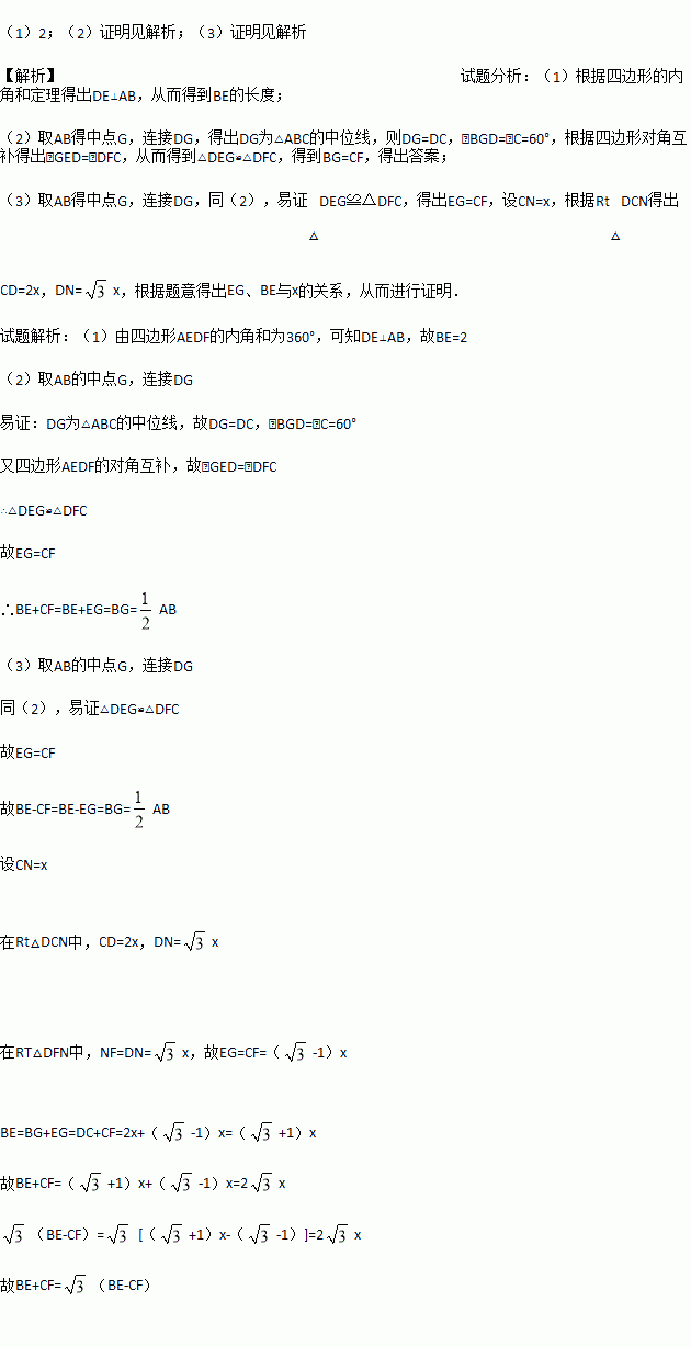 (3)如图3,将(2)中的∠EDF继续绕点D顺时针旋转一定的角度,使DF与线段AC的延长线相交于点F,作DN⊥AC于点N,若DN=FN,求证:BE+CF=