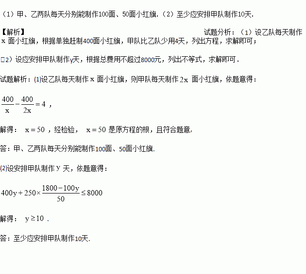 (2)已知甲队、乙队每天的制作费用分别是400元、250元,若要制作的小红旗的数量为1800面,且总费用不超过8000元,问至少应安排甲队制作多少天?