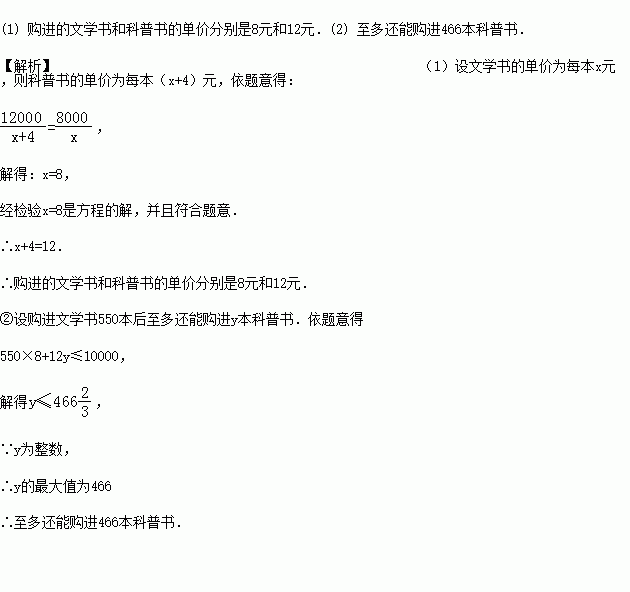 (2)今年文学书和科普书的单价和去年相比保持不变,该校打算用10000元再购进一批文学书和科普书,问购进文学书550本后至多还能购进多少本科普书?